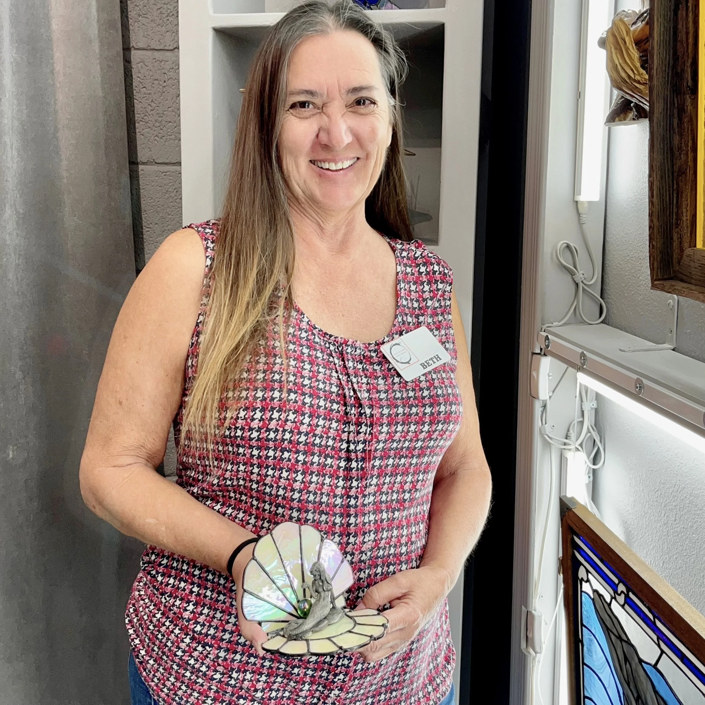 love to create beautiful things and started my artistic journey in high school focusing on pencil, charcoal, and ink sketches. I’ve always loved all forms of art and things inspired by this beautiful world we live in. In the 1980’s my parents got involved in creating stained glass &my mom taught me this beautiful art form I love using the unique colors & textures of stained glass to create beautiful works of art. In the early 90’s I had to give up working on glass to focus on raising my family but after many years away was able to retire early and had the opportunity to make several large custom windows for my own home and as well as a couple of large commission windows for others and doing so reminded me just how much I’d missed working with this special art form. Once I was finally settled in my new retirement home here in 2018, I slowly started setting up a new glass studio and after seeing just how many fantastic artists lived in our wonderful community, I was inspired to start making custom pieces and sharing my love for this unique craft. Art in all its forms give me joy and inspiration in life and while stained glass isn’t my only interest, it’s the one that give me a sense of satisfaction, knowing that many of the special pieces I’ve created will live in and give others joy long after I’m gone.